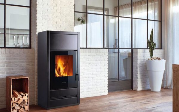 Estufa con diseño lineal totalmente revestida de mayólica, que calienta el ambiente por convección natural e irradiación, en los colores Bianco, Nero Opaco, Rosso Lava, Terra Cotta. Boca frontal orientable para la salida del aire caliente. Disponible también en versión hermética, con toma del aire de combustión del exterior y con sistema BCS.