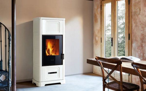 Estufa de leña que reinterpreta y actualiza el estilo clásico de las estufas de mayólica con el equilibrio de la forma y la suavidad de las líneas. Totalmente revestida de paneles de mayólica grandes y disponible en los colores: Bianco, Bianco Grigio, Rosso Lava, Kaki, Verde Mirto, Canapa. Frente con o sin boca frontal orientable. También en versión hermética y con BCS.