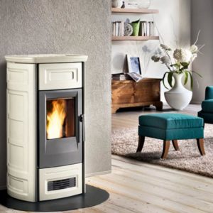 Estufa de pellet con dos superficies de mayólica, de un solo color en los colores Bianco Antico, Ardesia, Rosso Lava, o bicolor Bianco Antico-Terra Cotta, Kaki, Ardesia y Ardesia-Bianco Antico. Boca de ventilación frontal orientable. Es posible elegirla con el kit de bocas opcional para la salida lateral del aire caliente.